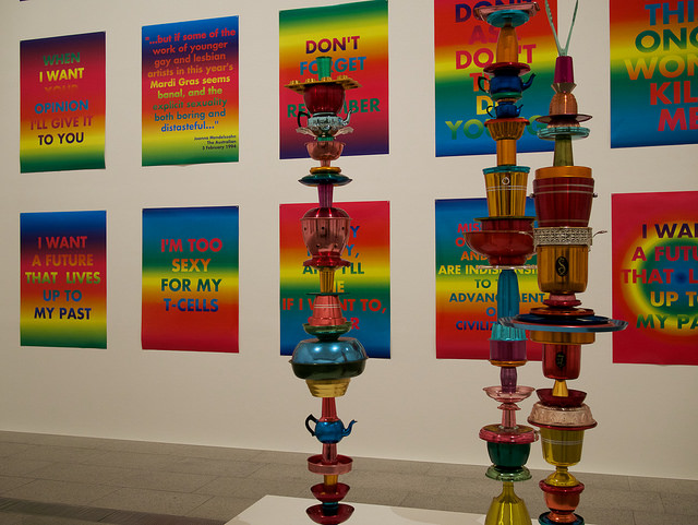 I love road tripping. The kid and I drove to Melbourne recently, specifically to go to RMIT’s Open Day but also to see friends and hopefully squeeze in a bit of art. Sadly we only managed a quick visit to the Ian Potter Centre, but so glad we did – the David McDiarmid show was fabulous. A sparkling mix of sex, politics, pattern and decoration, all set to a killer soundtrack.