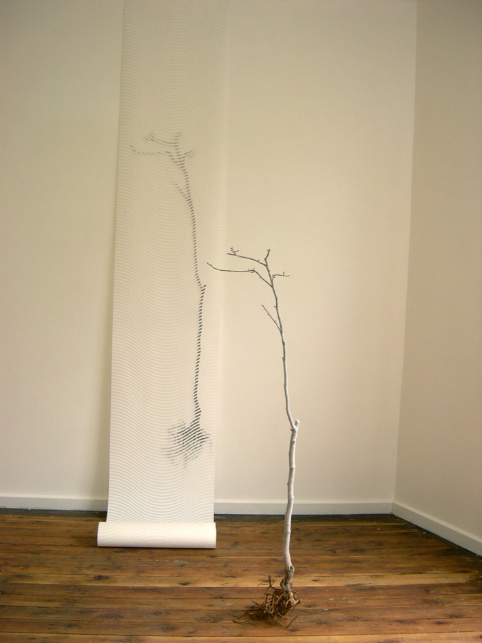 Magnolia Stellata Rosea 1996, 2006 (remade 2011), pencil on textured wallpaper, sugar and acrylic paint on magnolia sapling, dimensions variable