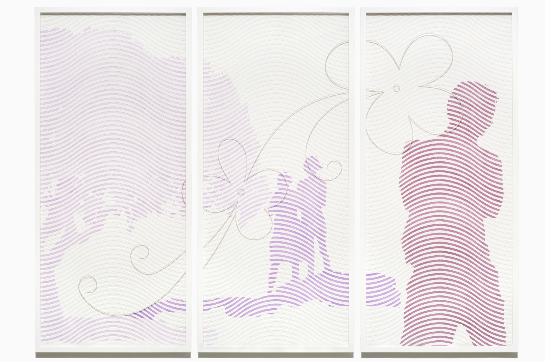 The Shadow of Love: Pattern Recognition, 2010/2013, colour pencil, ribbon, wallpaper, engraved acrylic sheet (Perspex), 3 panels 123 x 56cm each (framed)