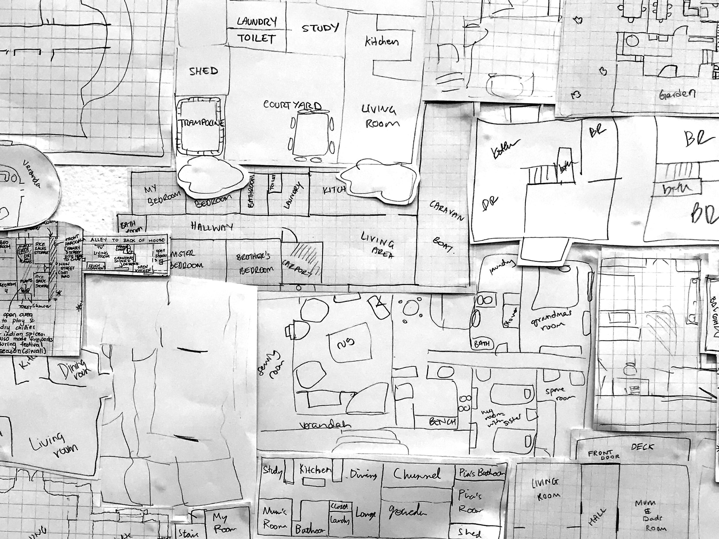 The Share House Project is a collaboration between writer Janine Mikosza and visual artist Stephanie Jones. We are exploring speculative architecture built on the foundations of memory, and are asking members of the public to contribute by drawing the floor plans of their childhood homes from memory. Click here for more details.